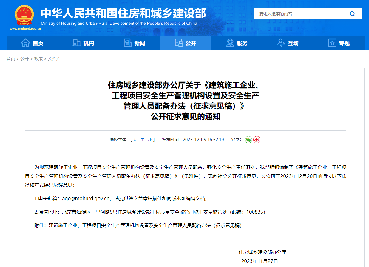 為規(guī)范建筑施工企業(yè)、工程項目安全生產(chǎn)管理機構(gòu)設(shè)置及安全生產(chǎn)管理人員配備,強化安全生產(chǎn)責(zé)任落實,住建部組織編制了《建筑施工企業(yè)、工程項目安全生產(chǎn)管理機構(gòu)設(shè)置及安全生產(chǎn)管理人員配備辦法(征求意見稿)》(見附件),現(xiàn)向社會公開征求意見。公眾可于2023年12月20日前通過以下途徑和方式提出反饋意見,明確指出如下